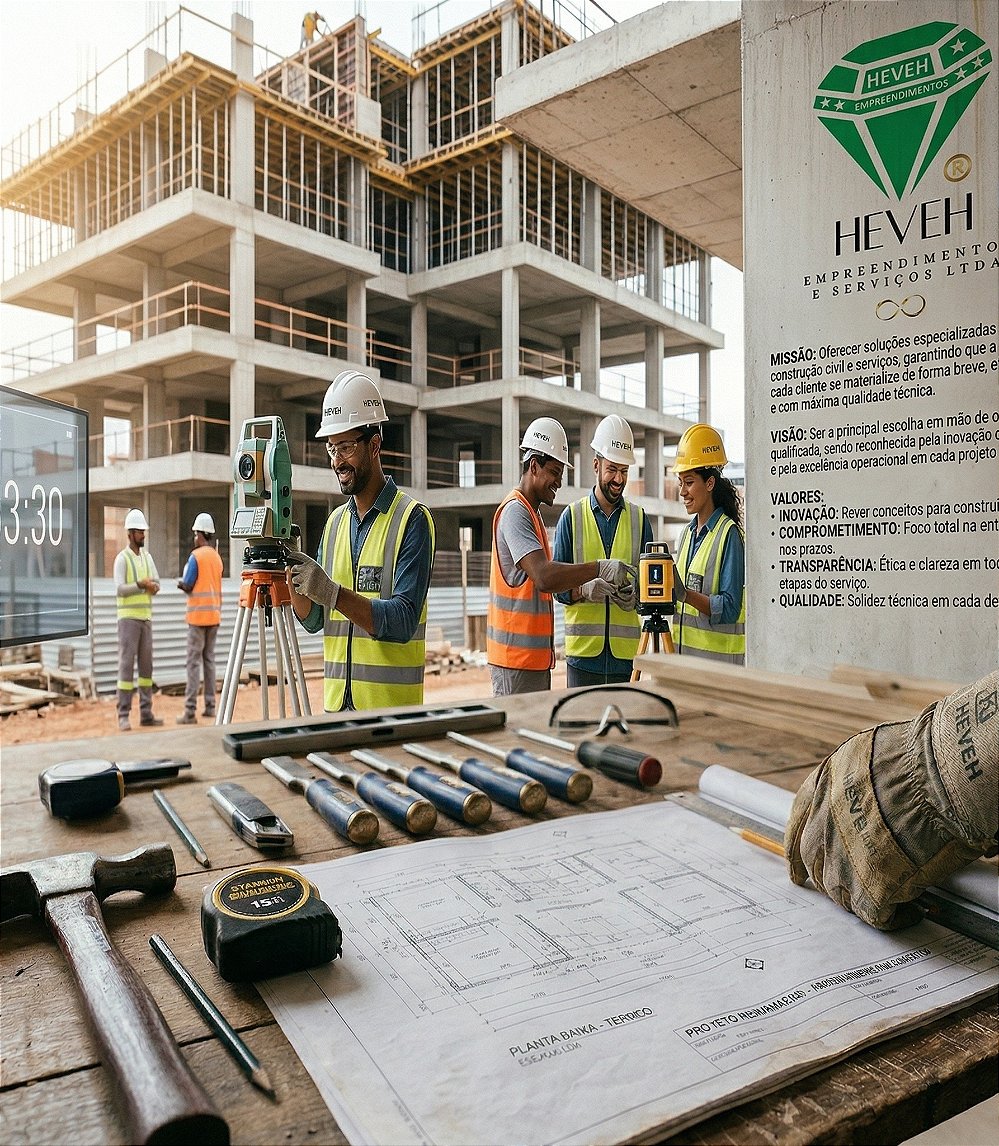 Na Heveh Empreendimentos e Serviços, reverberamos inovação em cada projeto. Entendemos que construir o amanhã é um dever que exige rever conceitos e se atrever a ir além do comum. Atuamos na intersecção entre a solidez da construção e a leveza estratégica do marketing, revelando o potencial máximo de cada empreendimento. Seja no canteiro de obras ou na criação de marcas relevantes, nosso compromisso é garantir que sua visão se materialize de forma breve e eficiente.